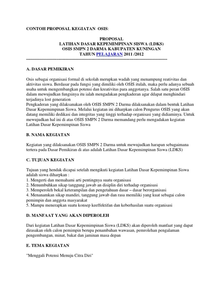 Contoh proposal ldks osis by anthrayuga in types > government & politics, proposal dan contoh. Proposal kegiatan latihan dasar kepemimpinan (ldk) organisasi siswa intra sekolah . 1 contoh proposal ldks proposal kegiatan latihan dasar kepemimpinan siswa (ldks) kementrian agama madrasah aliyah negeri. Kali ini kami bagikan contoh proposal ldks tingkat smp yang harus dibuat panitia pelaksana kegiatan sebagai referensi atau panduan yang baik dan . Kegiatan ldks merupakan upaya sistematis, terencana, dan periodik dari program pembinaan kesiswaan yang secara rutin diselenggarakan bagi para .
